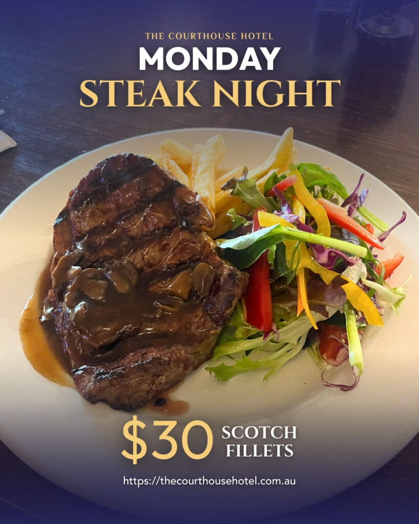 If Mondays need a reset button, this is it. Every Monday, The Courthouse Hotel Smythesdale runs Steak Night with a $30 Scotch fillet — simple, classic, and exactly what you want at the start of the week.